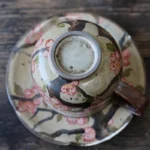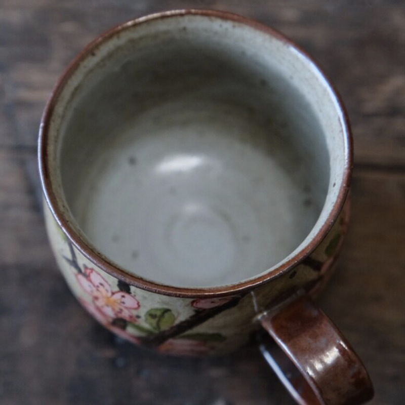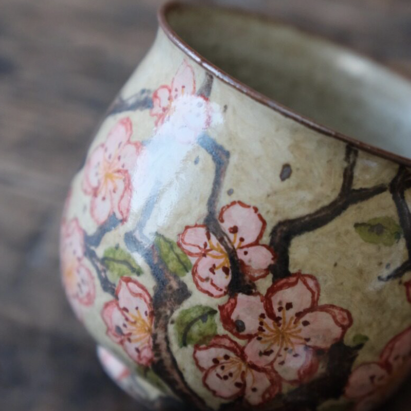 By artist Arden:Made from rough stoneware clay with a rustic, speckled texture and warm beige base, it feels warm and solid in hand—like holding a piece of winter sunlight. The red plum blossoms on the cup and saucer are hand-painted stroke by stroke: soft pink petals layer delicately, dark branches twist and stretch, and tender green buds peek through, rendered in fluid ink-wash brushstrokes that bring the garden’s hardy blooms to life on porcelain. In traditional aesthetics, plum blossoms symbolize resilience, purity, and the promise of spring—a quiet strength woven into the clay.