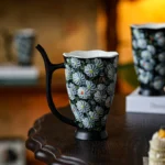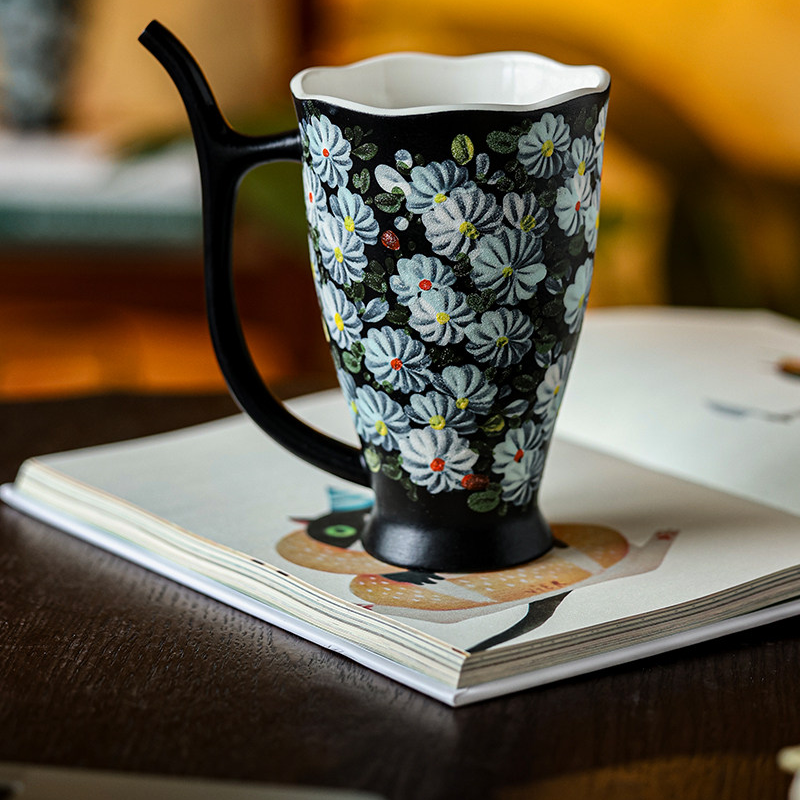 Bone China with hand-painted rock-color daisies, handle-as-straw design, wavy rim, 450ml large capacity, vintage healing handmade ceramic cup.