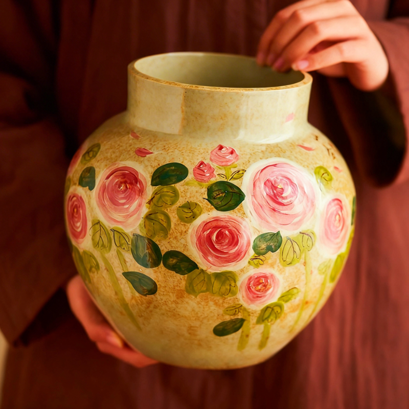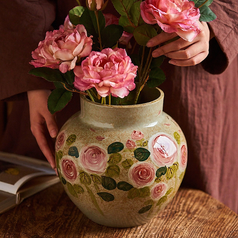 A hand-thrown ceramic vase, hand-painted with soft pink roses and green leaves. Its rustic, earthy texture brings a fresh, garden-like charm to your living room, dining table, or bedroom.