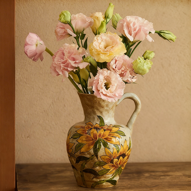 A cozy single-handle ceramic vase with hand-painted sunflowers on a warm speckled earthy base. Handcrafted texture and cheerful sunflower motifs bring rustic, sunlit warmth to your dining table, countertop, or bedroom