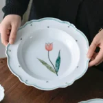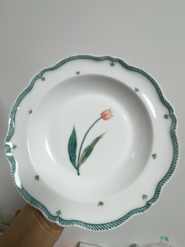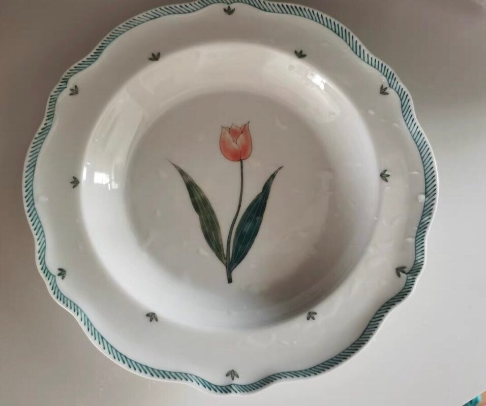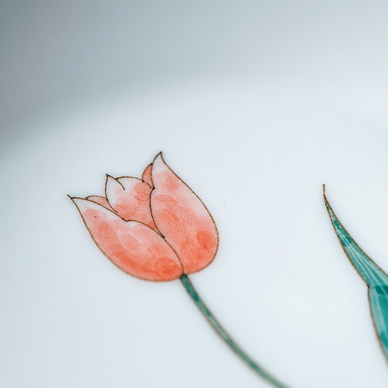 By artist Manxu:it’s a gentle scalloped edge, like the ruffle of a flower petal, with a thin green line tracing the curve and tiny green dots scattered along the rim. It’s not too fancy, just enough to make your table feel like a garden. The glossy white base is clean and bright, making the soft pink tulip and its gradient green leaves pop like a little watercolor sketch.this isn’t just paint on top of the ceramic. I painted every tulip petal, every green leaf, and every tiny dot on the rim before the final clear glaze was applied. Then the whole plate was fired at high temperature, sealing the color and pattern under the glaze. That means the design won’t fade, scratch, or leach into your food—no matter how many times you wash it, no matter what you put on it. It’s safe, it’s durable, and it’s meant to be used, not just admired.