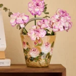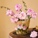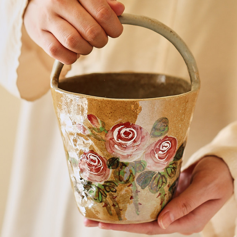 By artist Taomei:I painted each rose by hand using underglaze technique, layering soft pink petals with deep red edges, mimicking the way sunlight catches a blooming rose at dusk. The curved handle mimics a wicker basket, making it easy to carry—like you’ve just picked a bouquet from your own garden. The speckled clay base is rough and warm, grounding the delicate roses in earthy nostalgia, no two vases are exactly the same.