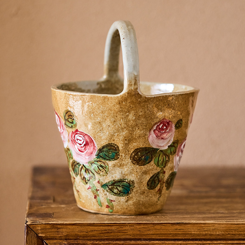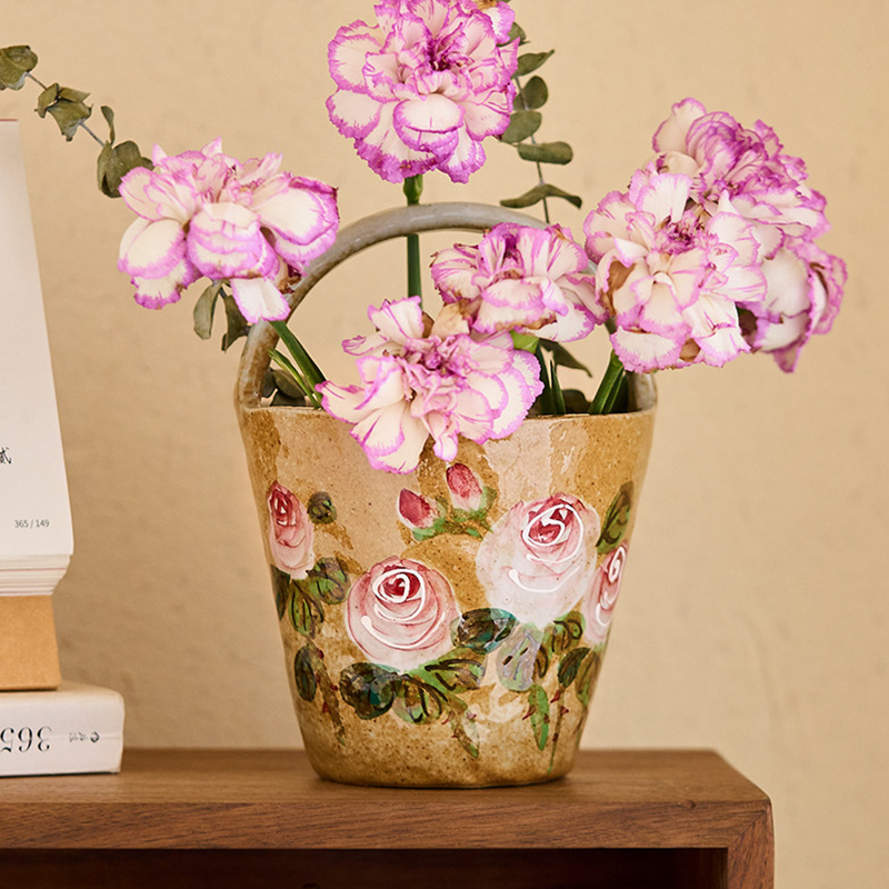 A basket-shaped ceramic vase with a curved handle, hand-painted with underglaze pink roses and green leaves. Its rustic speckled clay brings nostalgic, romantic charm to any living room, dining table, or bedroom.