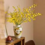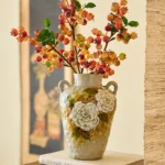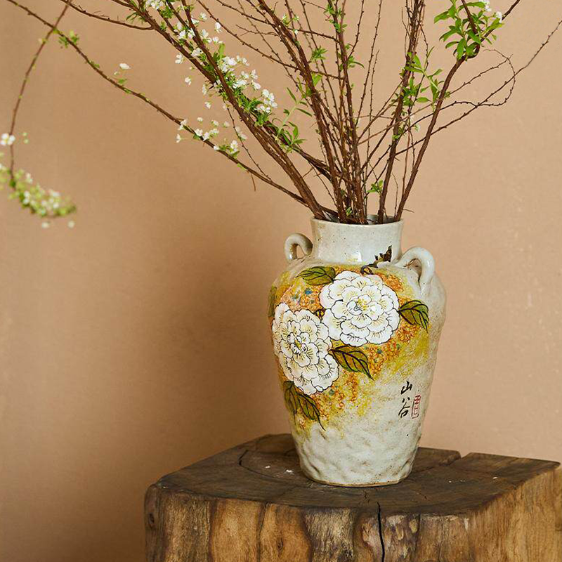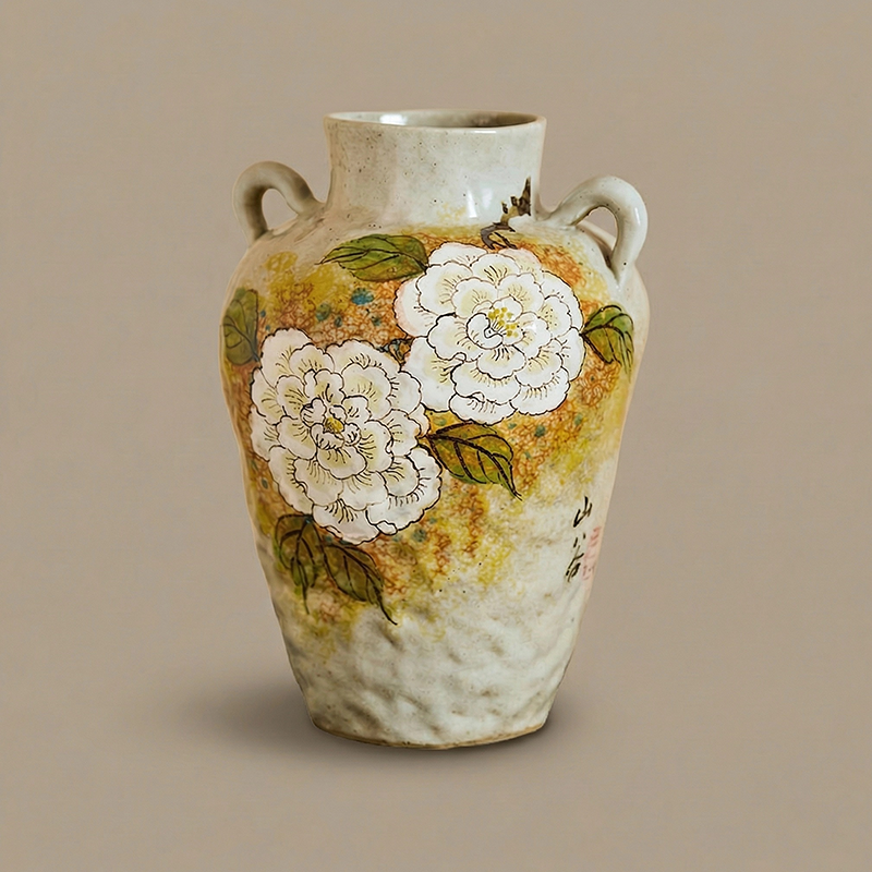 Hand-pinched rustic ceramic vase with two handles, featuring a creamy base with warm yellow-brown glaze and hand-painted white peonies. Embodying the peony’s symbolism of prosperity, fulfillment, and elegance, it brings calm, grand Eastern beauty to your home—each piece is one-of-a-kind handcrafted art.