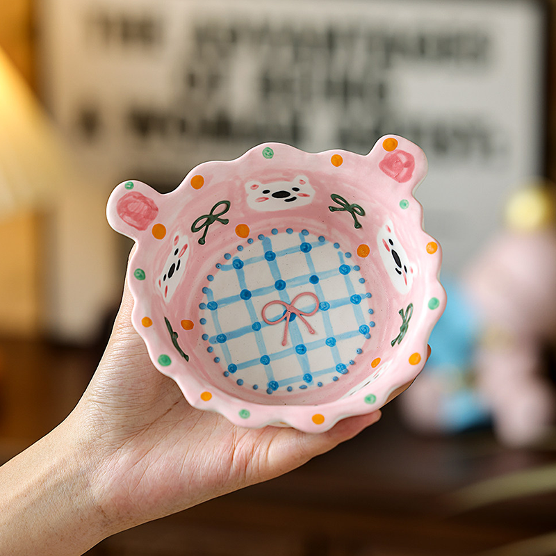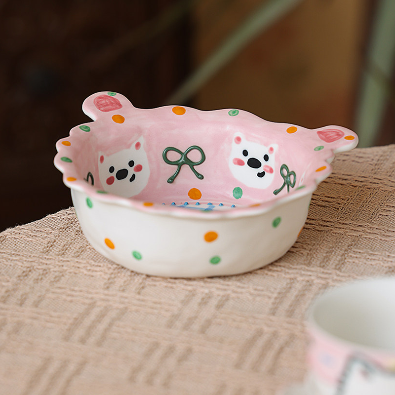 A 200ml adorable ceramic bowl from Jingdezhen! Hand-pinched & hand-painted with cute bear faces, polka dots, and bow details. Matte underglaze finish, microwave/dishwasher safe