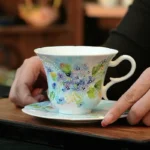 By artis Celia:This time, I used oil-painting strokes to paint plump hydrangea clusters on the cup, the gradient background like spring mist, and 3D pearl dots and gold accents like highlights in a painting. I hope whoever holds it can feel the romance of “living life like an oil painting” in a cup of coffee.The cup uses a sniff cup shape, with a slightly flared rim to gather aroma, and a streamlined hollow handle, both beautiful and non-slip. The 320ml large capacity holds a standard latte perfectly, matching cup-saucer design, ideal for daily use and table decor.