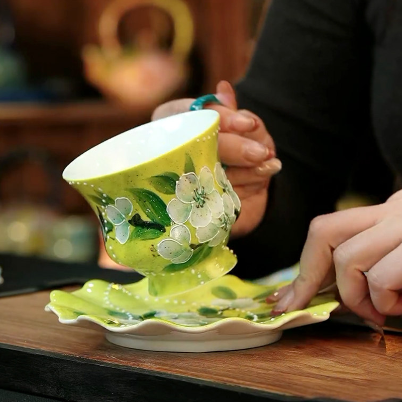 Bright yellow gradient high-white porcelain with 3D hand-painted jasmine blossoms, ruffled wavy saucer edge and pearl dot dewdrop details. 180ml capacity ideal for espresso and English afternoon tea—original handcrafted ware full of spring freshness and artistic vibe.