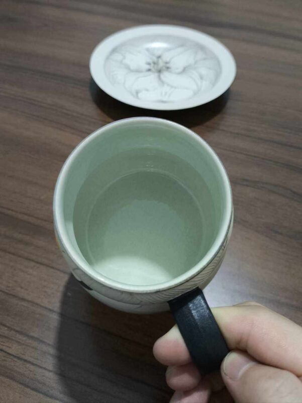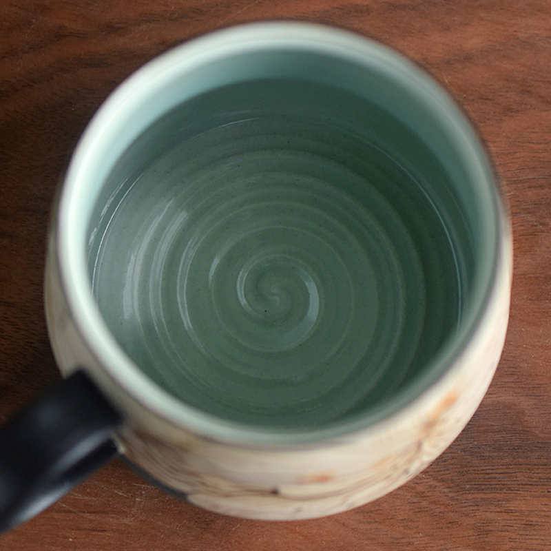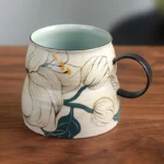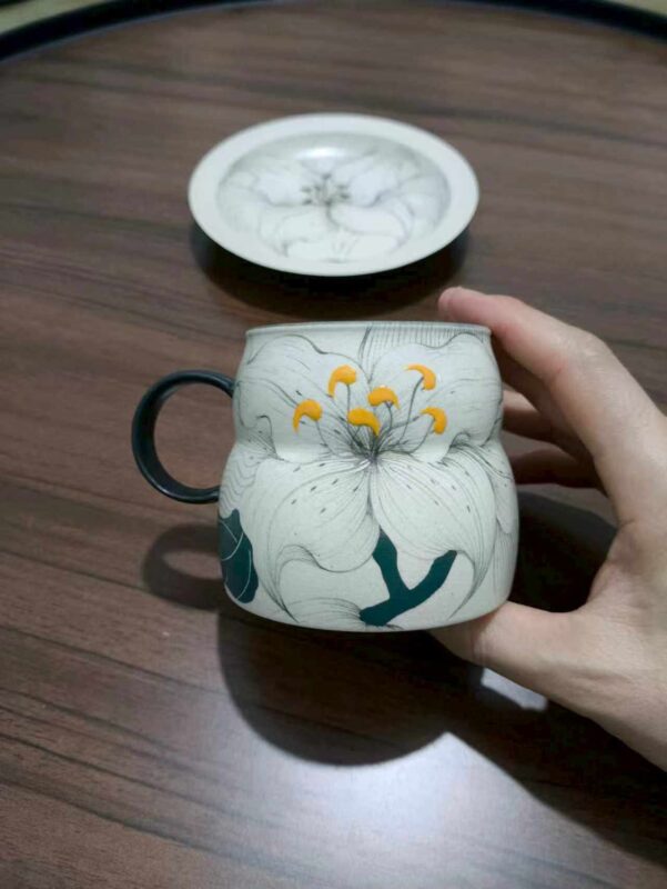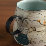 Rustic ceramic body with hand-painted ink lilies, soft teal inner glaze contrast. 300ml capacity ideal for lattes and American coffee—original handcrafted ware blending Eastern poetry and American retro vibes.