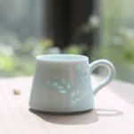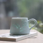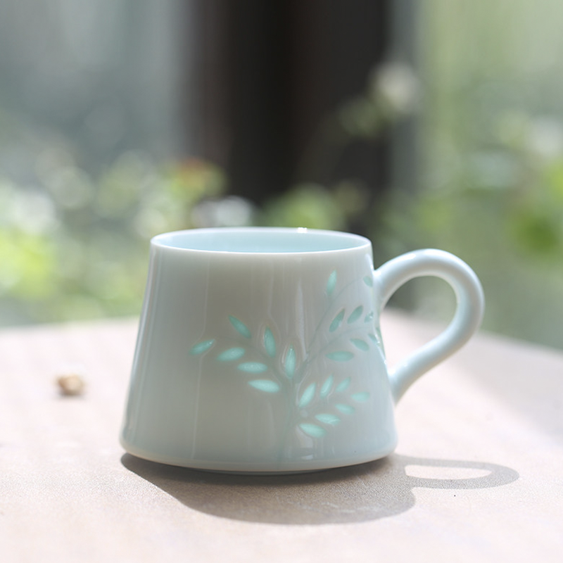 By artis Modu:On the Linglong porcelain blank, I hand-carve the foliage patterns with a knife, controlling the arc and vein of every leaf personally, then apply celadon glaze and fire at high temperature. The celadon foliage patterns are delicate and translucent in light, as if hiding the vitality of spring in the mug, turning daily tea or coffee into a healing ritual close to nature.