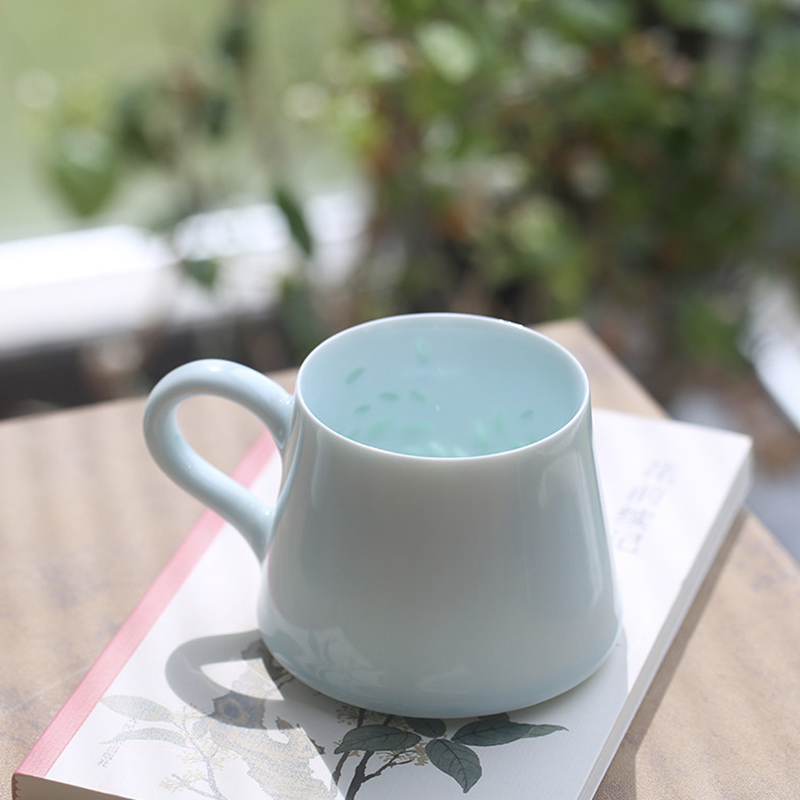 Hand-carved Linglong porcelain craft, celadon “Lush Foliage” pattern, fired at 1330℃, 280ml capacity, a warm healing Jingdezhen handmade mug.