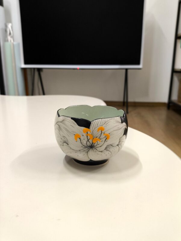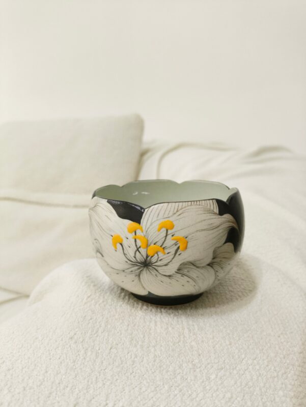By artis Nora:The lily symbolizes “purity, rebirth, and midnight peace,” a healing icon of “blooming even in darkness,” like those solitary moments in our lives: no need to please anyone, just be quiet and be yourself, and find inner order in a cup of coffee. I used hand-painted underglaze art to recreate the lily’s posture in the midnight, bottling this “midnight lily tenderness” into porcelain. Every grasp feels like holding a small beam of moonlight, touching the poetry of solitude even in the city.
