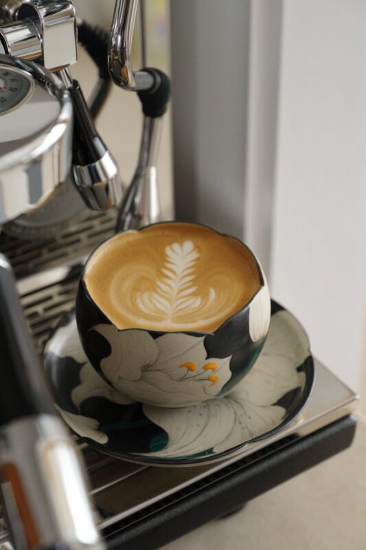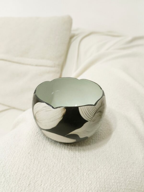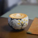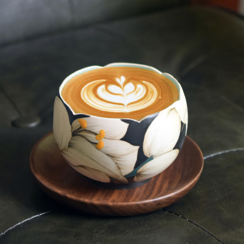 Rustic black stoneware base with hand-painted underglaze white lily motifs, hand-carved petal rim, and warm matte texture. 200ml capacity ideal for espresso and piccolo coffee—handcrafted ware to hold midnight tenderness and solitude poetry.