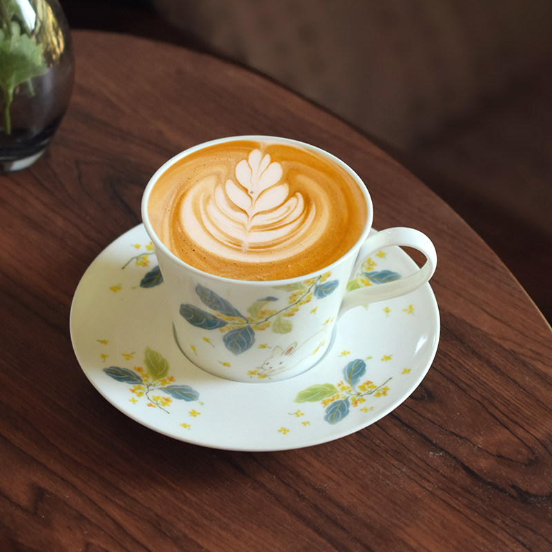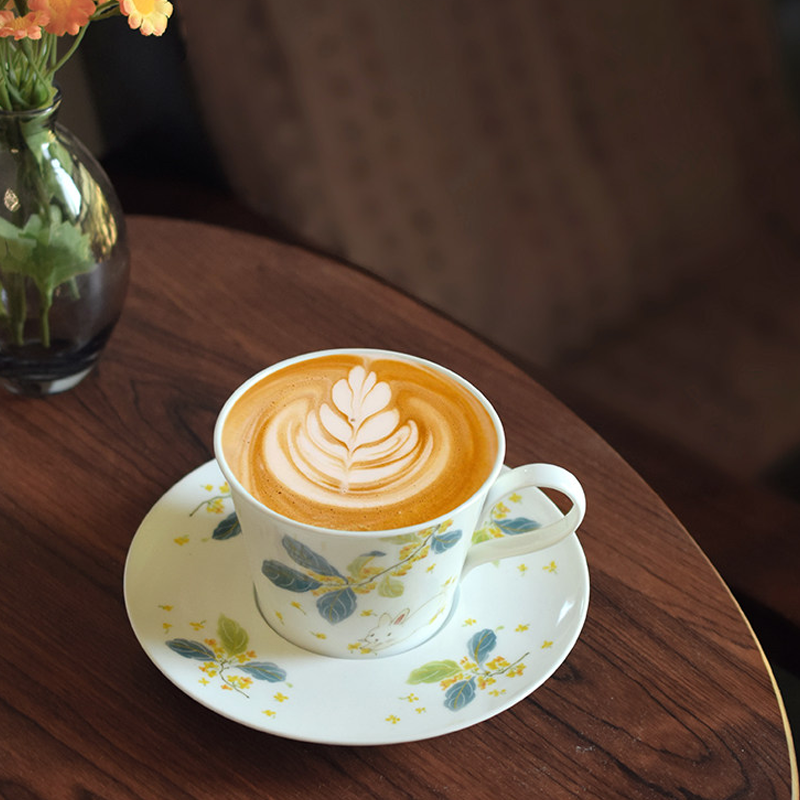 Warm high-white porcelain painted with moon palace osmanthus and celestial rabbit, elegant cup with matching saucer. 240ml capacity for lattes & afternoon tea—handmade ware holding the tender legend of the moon.