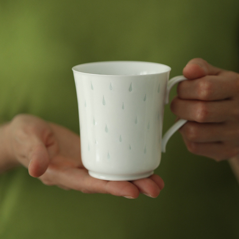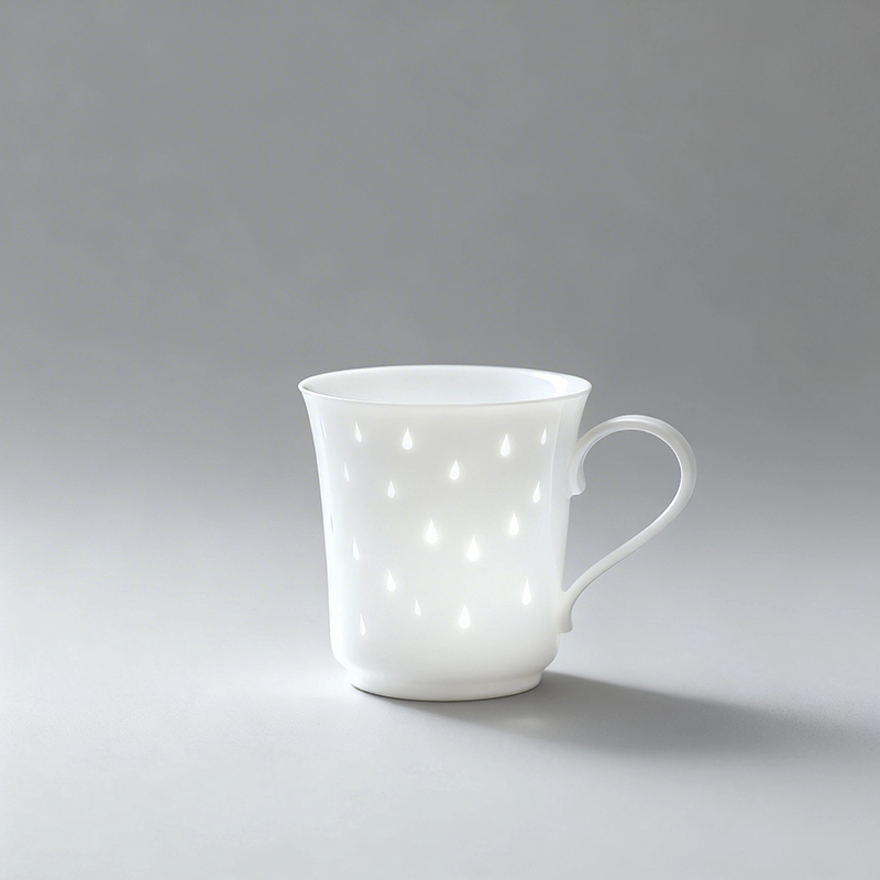 This cup is inspired by the morning dew on grass blades—every raindrop-shaped Linglong hole is hand-carved by me, glowing translucent in backlight, as if sealing the spring dew into the porcelain, hiding “the lightness and gentleness of nature” in daily cups. When you feel tired from busy work or life, pick up this warm white porcelain cup and look at the hand-carved translucent raindrop holes in the light—it’s like being gently embraced by the morning breeze.