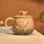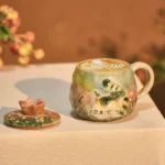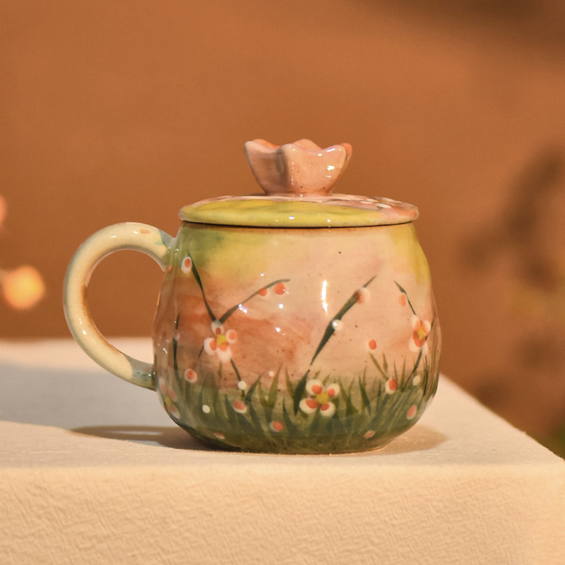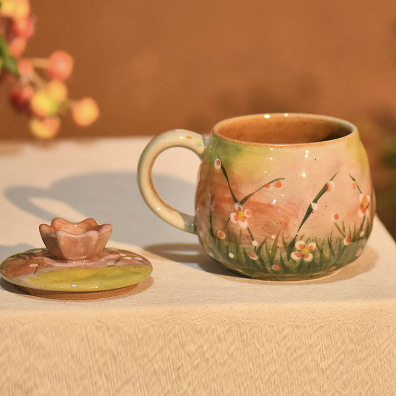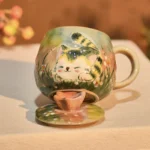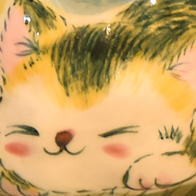 By artis Willow:Full-body hand-painted napping tabby and spring meadow, fresh yellow-green gradient base, vivid details like pink cheeks and tabby stripes. The lid top is pinched into a 3D small flower, preventing dust and adding cuteness, and the lid body is painted with the same meadow pattern, making the whole set a healing decor piece.