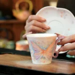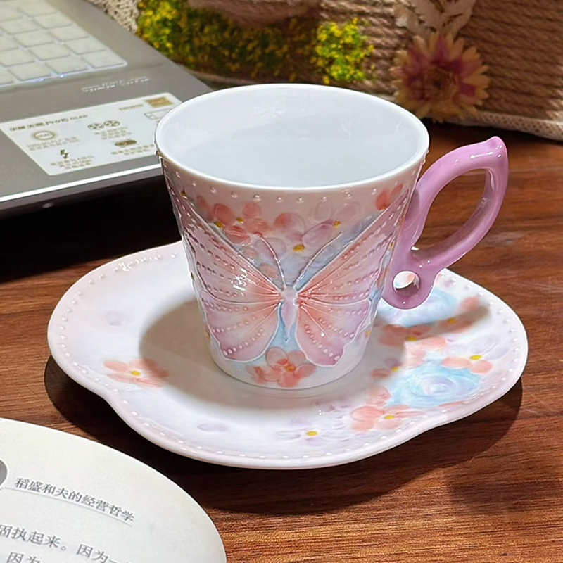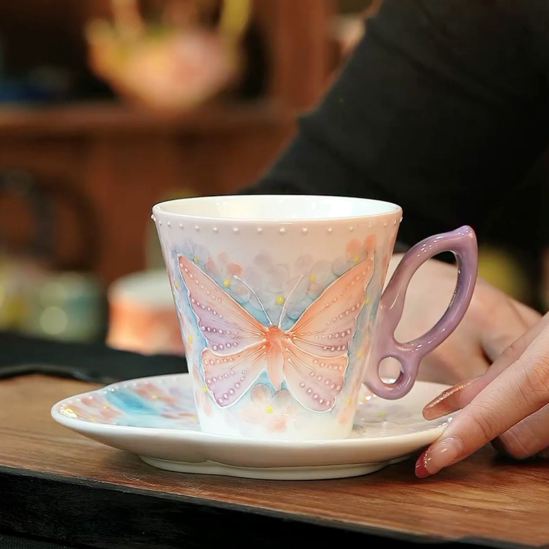 By artis Celia:Rainbow butterflies use hand-stacking + underglaze craft, with 3D raised wings and delicate textures, rich color layers, like vivid creatures just flown from the flowers. High-fire firing locks colors permanently beneath the glaze, ensuring no fading. Each butterfly posture and gradient depth is hand-done by me—no two sets are identical.The saucer uses a hand-kneaded flower-shaped edge, echoing the romantic vibe of the cup. The handle has a pink-purple hollow shape, both beautiful and non-slip. The 200ml capacity holds an espresso or English afternoon tea perfectly, matching cup-saucer design, ideal for daily use and table decor.