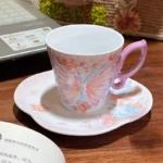 Dreamy pink-purple gradient high-white porcelain with 3D hand-painted rainbow butterflies, flower-shaped saucer edge and pearl dot details. 200ml capacity ideal for espresso and afternoon tea—original handcrafted ware full of romance and healing vibes.