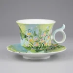 By artis Celia:This set was inspired by an early morning stroll in the forest,—mist still lingered, lily of the valley hung dewdrops on the branches, colorful petals glowed in the morning light, etching “the secrets of the forest” into the leaves.White pearl dots on the cup and saucer resemble dewdrops on lily of the valley, the handle has a circular hollow shape, both beautiful and non-slip. The 180ml capacity holds an espresso or English afternoon tea perfectly, matching cup-saucer design, ideal for daily use and table decor.High-fire porcelain is acid and alkali resistant, microwave and dishwasher safe. Just rinse with cold or warm water daily; do not use hard objects on the 3D lily of the valley.May you remember those quiet moments when holding it, knowing that happiness will always return.