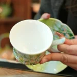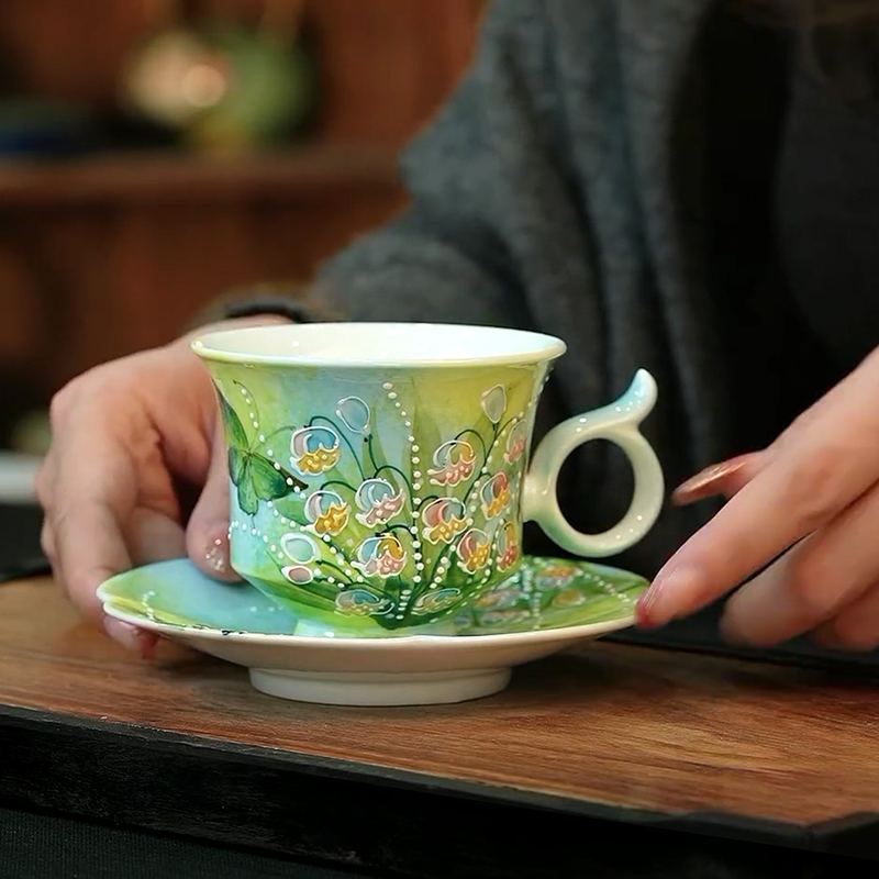 Gradient green high-white porcelain with 3D hand-painted rainbow lily of the valley, accented by butterflies and pearl dots. 180ml capacity ideal for espresso and English afternoon tea—original handcrafted ware full of forest healing vibes.