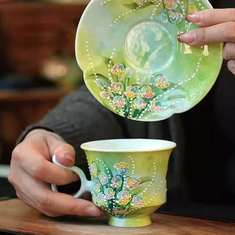 Rainbow Lily of the Valley Hand-Painted High-Fire Underglaze Cup & Saucer Set