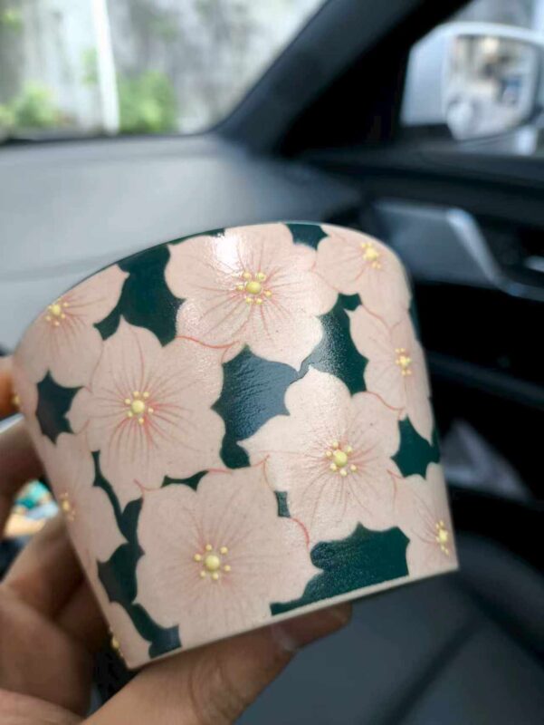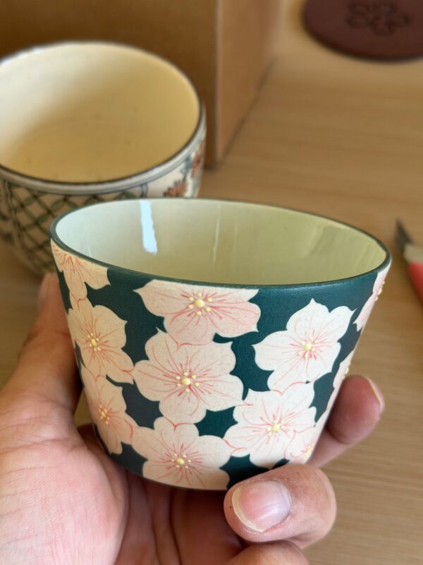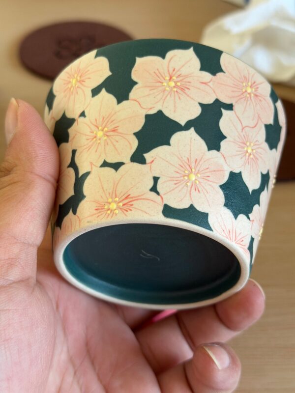 By artis Nora:Pink cherry blossoms are painted using underglaze art, with natural petal gradients and 3D stamens as highlights. Spring in a cup .Hand-painted cherry blossoms dance on deep teal stoneware—every petal, every stamen is handcrafted. 230ml perfect for lattes.No two cups are the same, just like no two spring days are alike.Tag someone who needs a little spring tenderness in their life