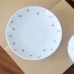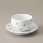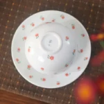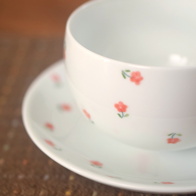 By artis Nora:Florals and leaves are painted with underglaze technique, with clean delicate lines and fresh pink-orange tones. High-fire firing locks colors permanently beneath the glaze, ensuring no fading. Each flower’s position is slightly different.Ditsy florals are a classic symbol of “spring, pastoral, and girlish charm,” with a fresh vibe that instantly relaxes people; the warm high-white porcelain carries the simple warmth of American country style, turning tiny joys into daily ritual.