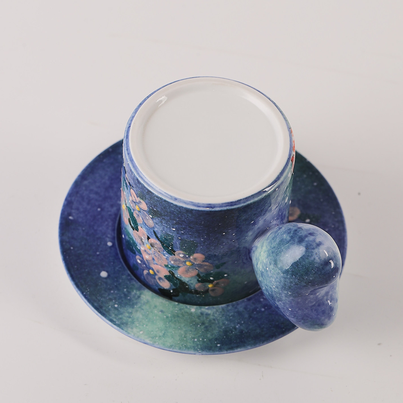 Starry gradient glaze + hand-painted nine-tailed fox, heart handle + cherry blossom saucer, 260ml capacity, mysterious healing handmade cup & saucer set.