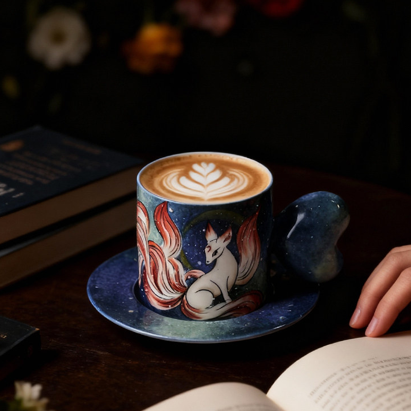 Starry Night Nine-Tailed Fox Hand-Painted Cup & Saucer Set