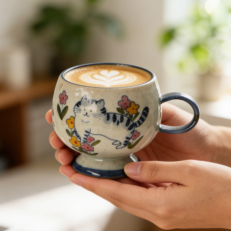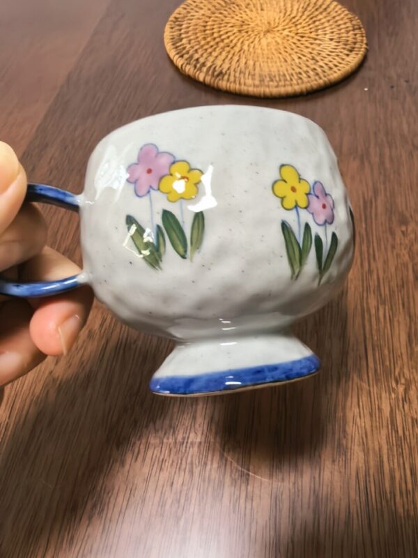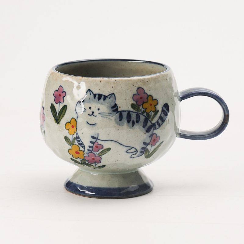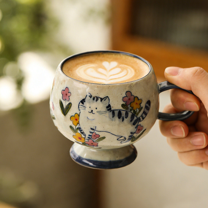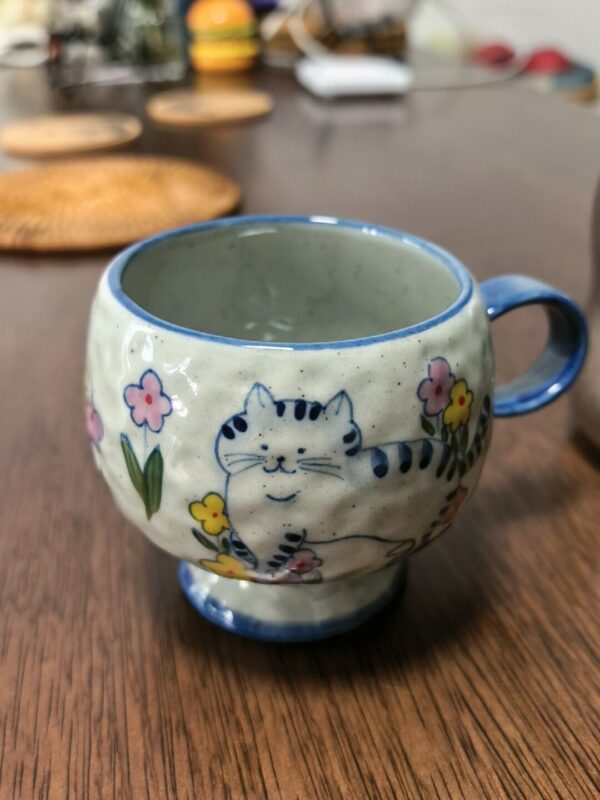 By artis kai:Hand-pinched, keeping the clay’s natural tiny grains and handcrafted marks—warm and thick, holding it feels like hugging a tiny kitten, great heat insulation so it won’t burn your hands with hot lattes!I made the chonky mug shape like a cat’s round belly, the pedestal base like it tiptoeing on grass, and painted the body full of pink and yellow flowers, sealing the softness of a spring garden into the clay!