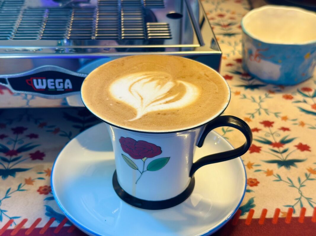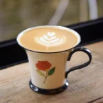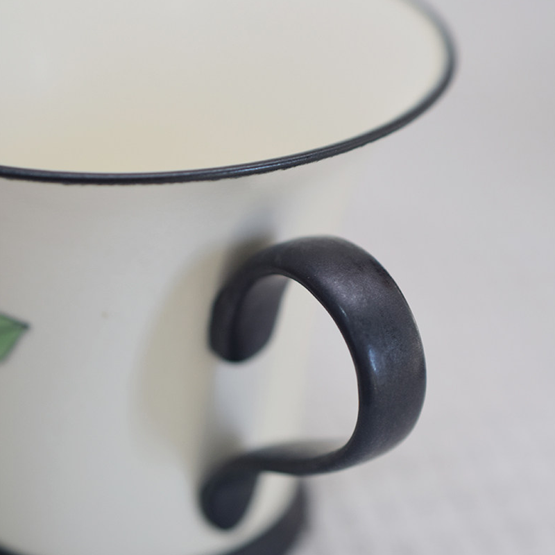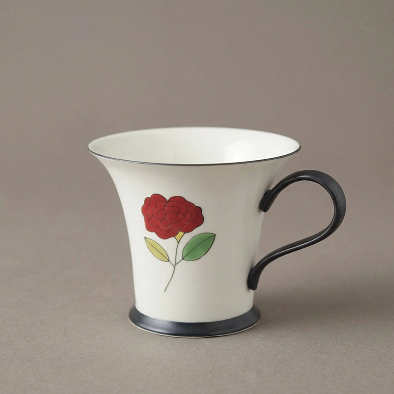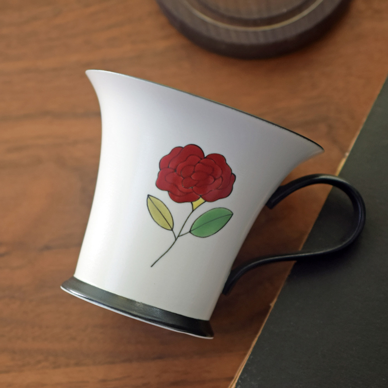 Warm white plant ash glaze body with hand-painted red roses, retro black handle & base contrast. 250ml capacity ideal for lattes and American coffee—gentle healing handmade coffee cup.