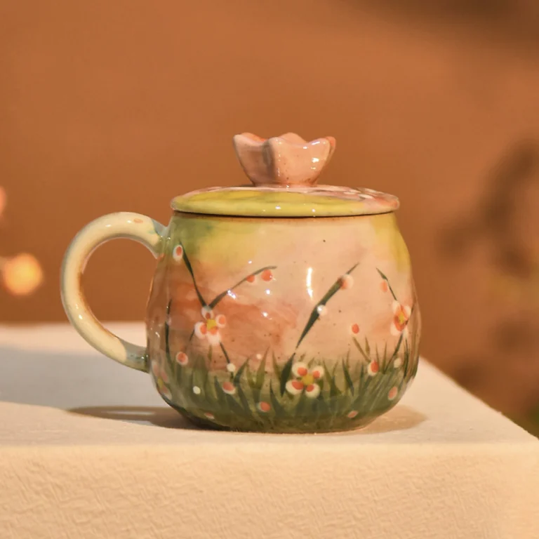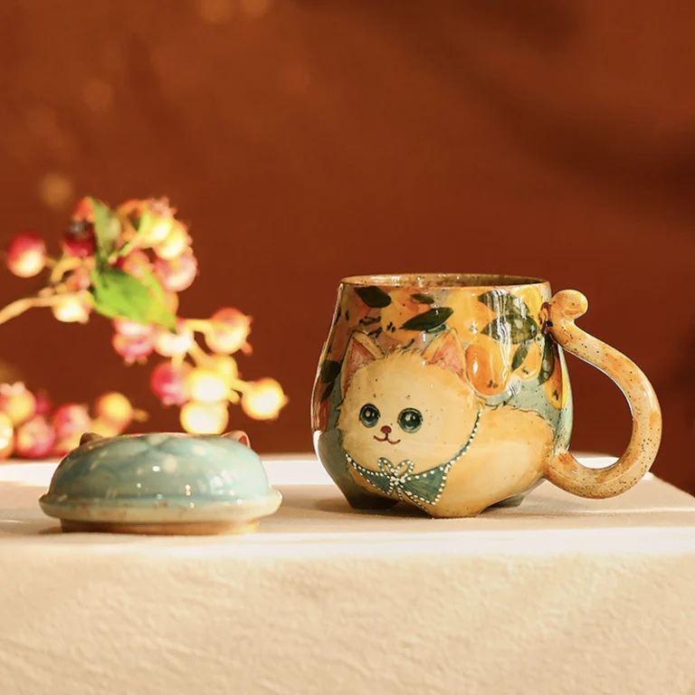 Tangerine Cat & Kumquat Hand-Painted Lidded Mug