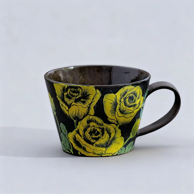 Raw mineral purple clay body with clear glazed interior for easy cleaning. High-fire under-glaze black-and-gold rose pattern. 270ml capacity ideal for coffee and tea—restrained yet intense vintage texture.