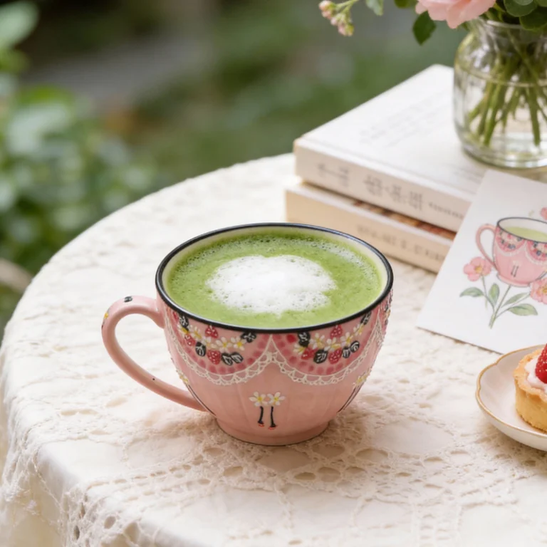 Soft pink base + hand-painted lace trim + daisy accents, handcrafted in Jingdezhen. 200ml capacity for coffee, matcha, or afternoon tea—cute and cozy, the perfect vibe for your desk!